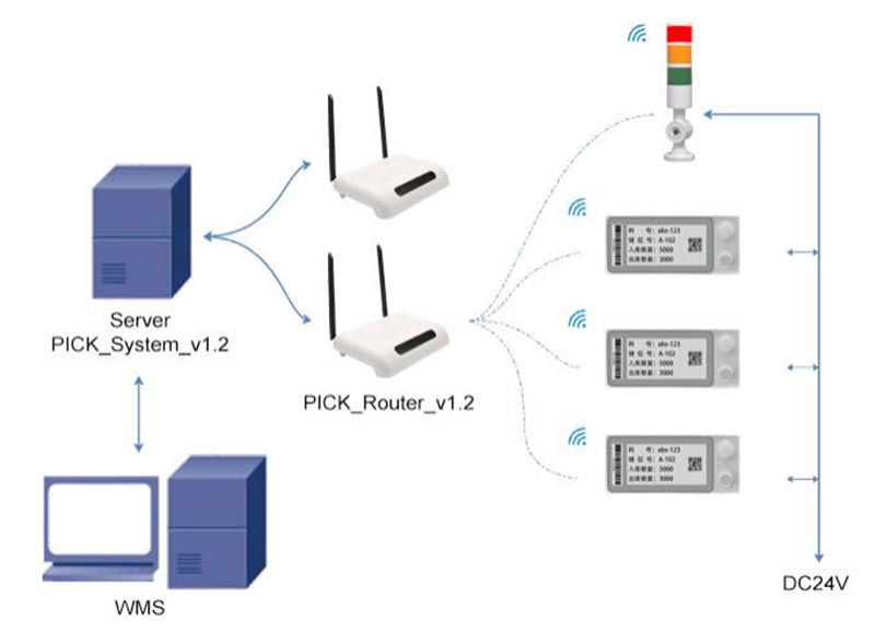 注:电子标签拣货系统就是通过PC机或扫描枪发送指令,通过路由器转发,控制电子标签上的LED灯或屏幕指引拣货人员准确,快速地到指定的位置拣取相应的货物。